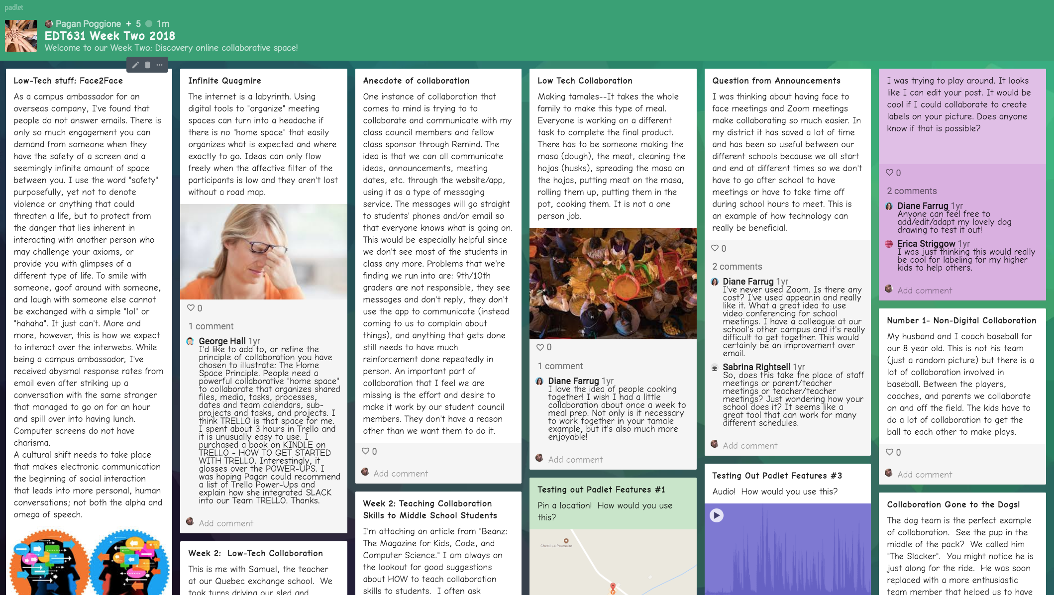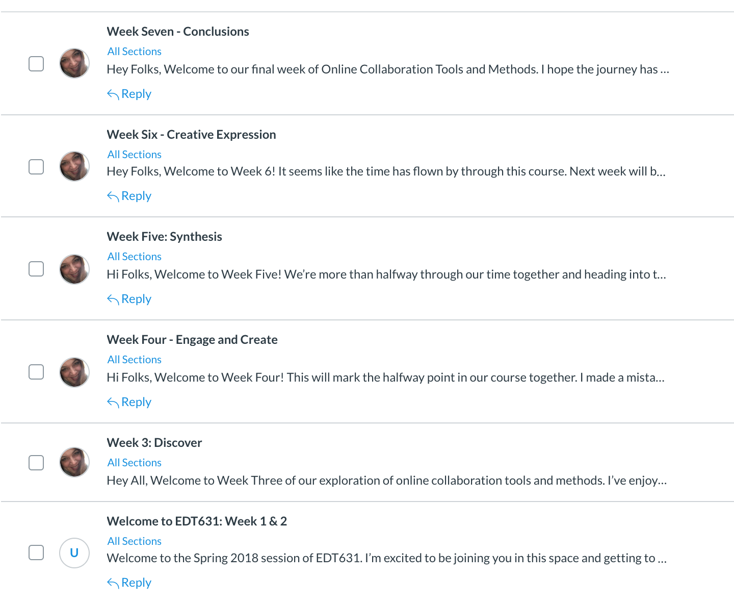 The LMS used for this course was Canvas. There was a course announcement for each week in the LMS and that was the main “home” for the course. That said, the bulk of the course took place in other online spaces. I am passionate about team development, management, and technology mediated collaboration. EDT 631 was an opportunity to share knowledge with my learners, play with them, and introduce them to a “crash” course in online tools, virtual team collaboration, and project based learning. Each week had a theme and a new tool to engage in collaboration with others. Learners had to create two reviews of online collaboration tools. The reviews were peer reviewed and collaboratively edited. The group also had to collaborate as a whole to determine how they were going to share their reviews/new knowledge with the outside world.